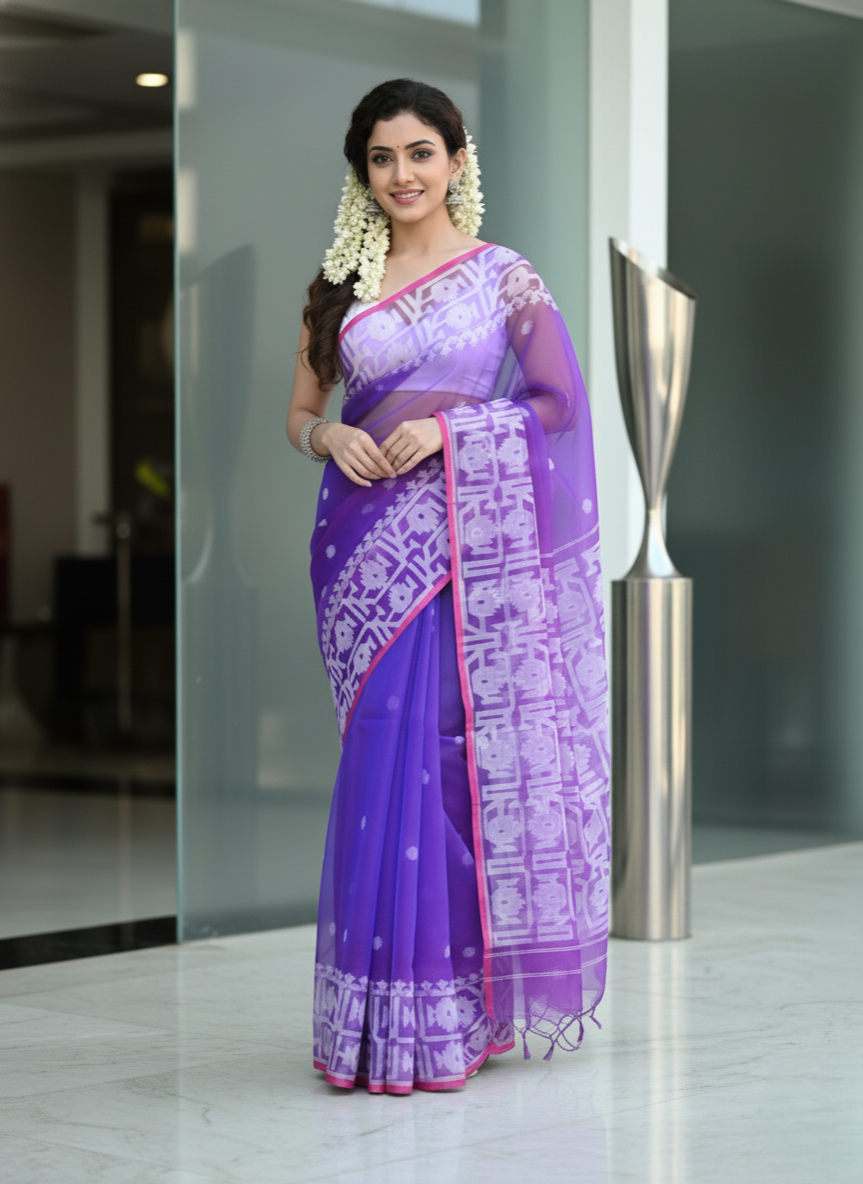 Explore our Jamdani Sarees Collection, showcasing intricate motifs and fine craftsmanship as a testimony of Bangaliana candor & artistry. Be it Cotton or Silk (Resham), this magical weave creates a spell of charismatic style statement at all occasions. Show now & experience the unparalleled grace in every yard of Jamdani weave.