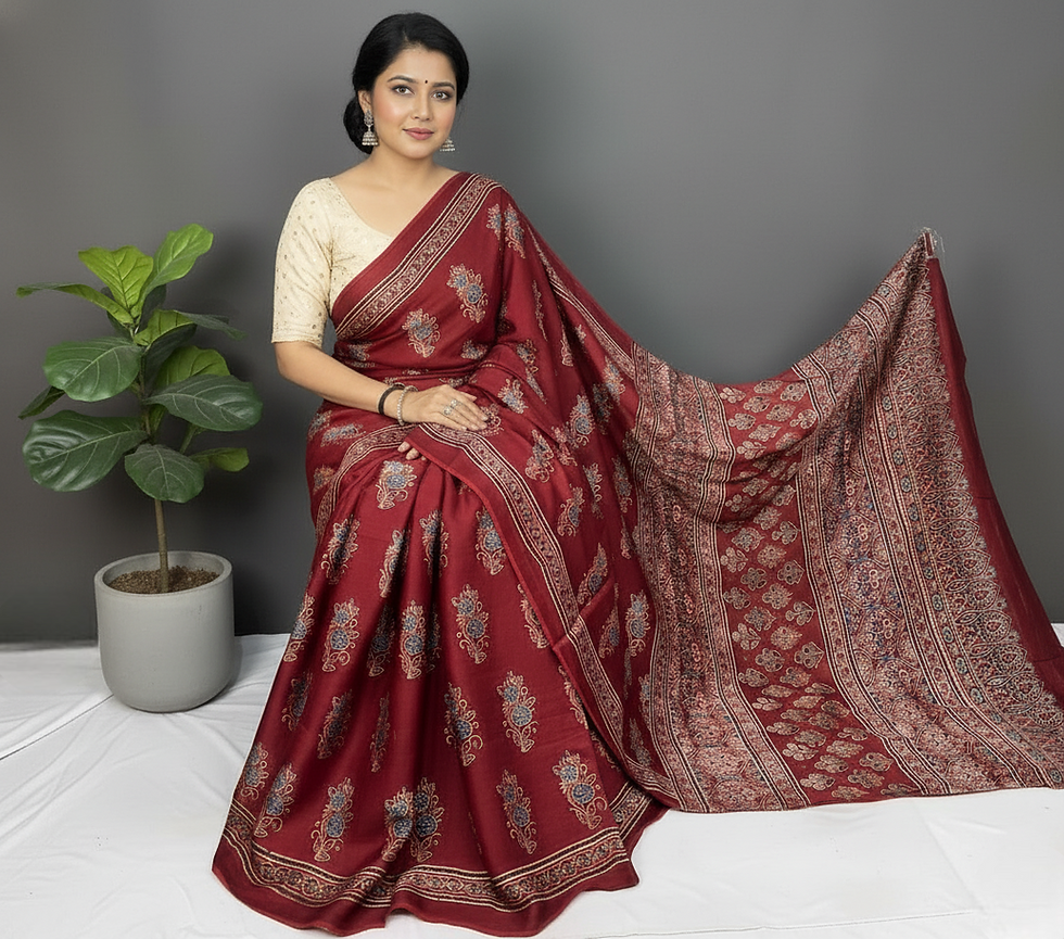 The primary specialty of Ajrakh saree is the intricate hand block printing technique used to create the designs. Skilled artisans carve intricate wooden blocks with traditional patterns and motifs. These blocks are then dipped in natural dyes and painstakingly stamped onto the fabric, layer by layer. This labor-intensive process results in mesmerizing geometric and floral patterns that are both unique and visually striking.The use of natural dyes not only adds to the aesthetic appeal but also makes the saree eco-friendly and safe for the environment. Many of the motifs and patterns in Ajrakh sarees have cultural and symbolic significance. These designs often draw inspiration from nature, folklore, and traditional beliefs, making each saree a storytelling piece of art.