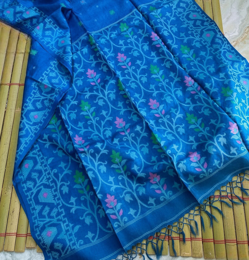 Jamdani weaving involves adding supplementary weft threads to the base fabric to create the desired design. These supplementary weft threads are typically made of fine cotton or silk and are carefully interwoven with the base fabric to create the intricate motifs. The process requires a high level of skill and precision, and the weavers often work on traditional pit looms using hand-operated techniques. Jamdani fabrics are known for their delicate and intricate patterns, often featuring floral motifs, geometric designs, or figurative elements. The patterns are created by the skilled hands of the weavers, who meticulously weave the supplementary weft threads to create the desired design. The resulting fabric has a distinctively airy and light feel, making it comfortable to wear in hot and humid climates. Jamdani textiles are highly prized for their craftsmanship and artistic value. It's often associated with special occasions and are considered luxurious due to the labor-intensive process involved in their creation. Today, Jamdani weaving is not only a traditional craft but also a symbol of cultural heritage and identity for the communities that practice it. Efforts are being made to preserve and promote this ancient weaving technique, and Jamdani textiles continue to be cherished for their beauty, craftsmanship, and historical significance.